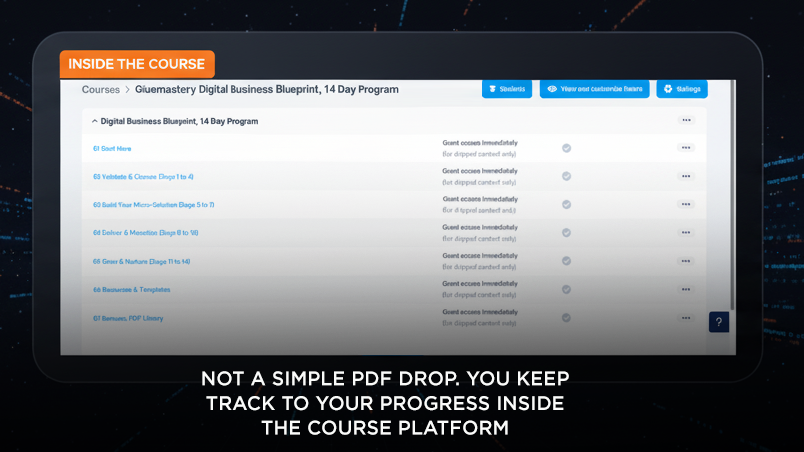 This Blueprint is designed for 60–90 minutes per day. The structure is lean on purpose, so you keep making progress without overwhelm. Each lesson includes a short video and a concise PDF QuickStart, so you always know what to do next.